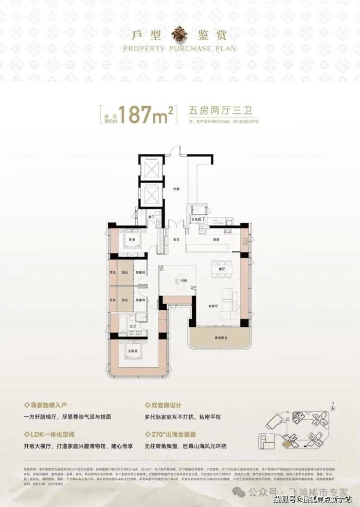 187㎡五房采用横厅设计,面宽超7米,搭配全景落地窗。双套房设计满足多代际家庭居住需求,让家人既能共聚天伦,又能保持适当的私密性。