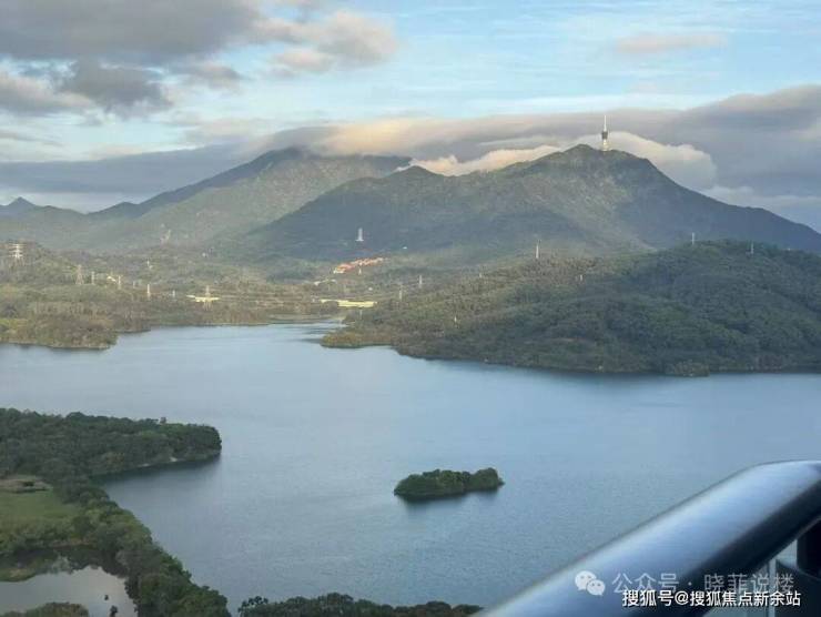 (高空实景拍摄远景,可见求山水山脉走势及东湖水库景观。)