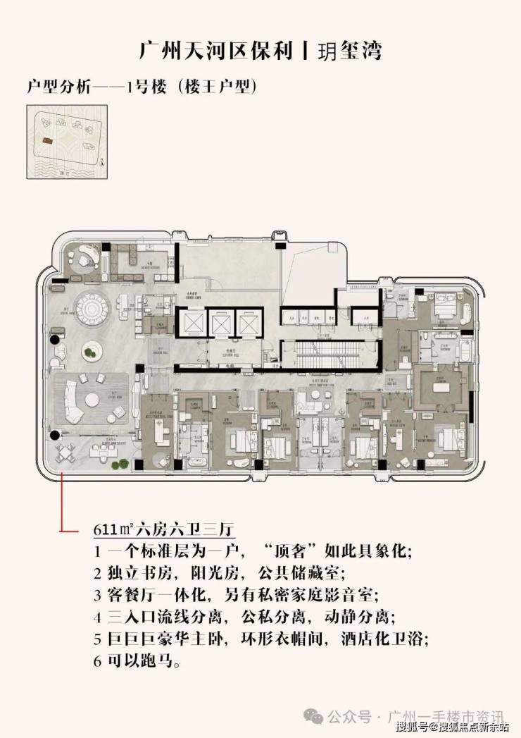 项目1号楼611㎡楼王户型套均售价约一个亿起步,楼王户型均价在18万左右/㎡,一层一户的设计让每一户都能拥有270°的环幕江景视野,整个1号楼611㎡的楼王产品也仅有30套稀缺单位可售,注定将会颠覆广州顶豪市场非常抢手!