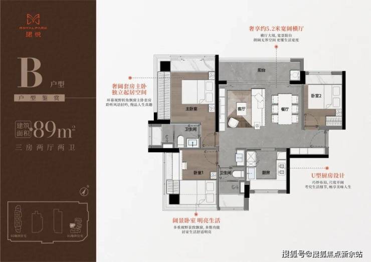89㎡三房二卫A/B户型,位于1栋一单元,两开间阳台,主卧都有双面凸窗赠送。