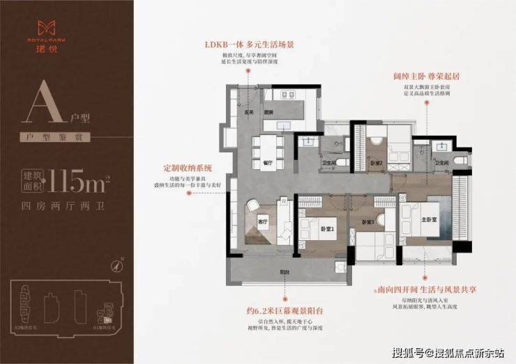 115㎡四房二卫A/B户型,大阳台,主卧通过凸窗赠送衣柜,但次卧尺度都偏小。