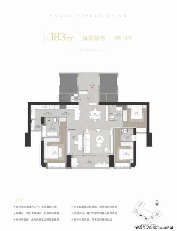 183㎡4房3卫:双套间设计,主卧配备衣帽间与观景卫浴,采用汉斯格雅卫浴、西门子智能厨房;