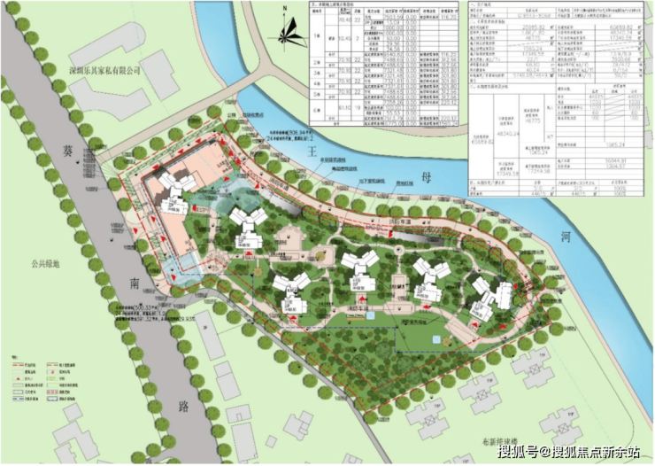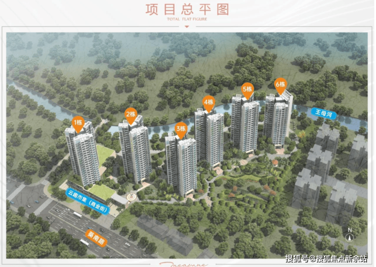 地块北面临王母河,南面为布新统建楼层高11 层,西面为葵南路,南面和西面,视野开阔,无遮挡,为最大化南向采光及景观视野,6栋楼栋以蝶形点式排列。