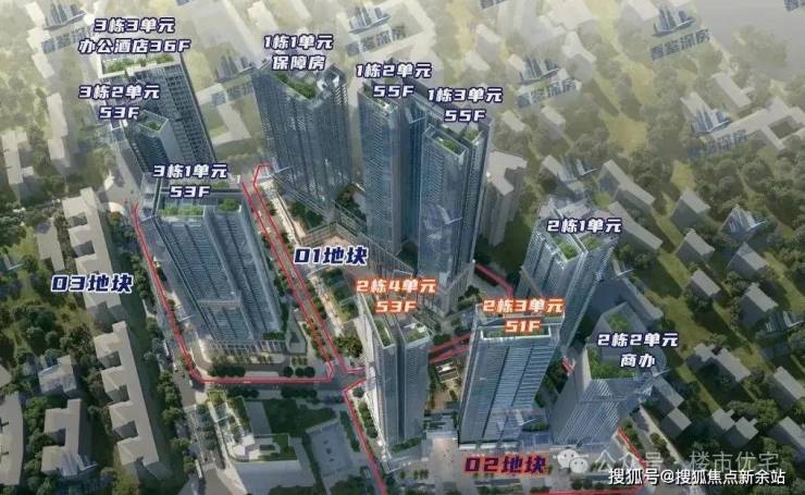 规划为3栋超高层塔楼住宅+幼儿园,1栋一、二单元193米55层,1栋三单元为保障房157米44层。