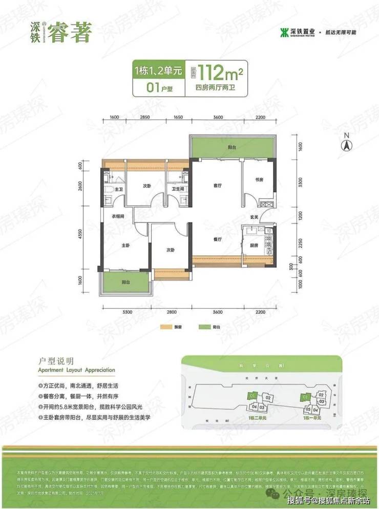 112㎡的4房2厅2卫,1栋1/2单元01户型,设计的是竖厅南北通透格局,进门入户玄关,客厅3.6米开间,实测高达23.88㎡餐客分离,餐厨一体设计,四开间朝南,主卧套房带阳台,分别做到了主卧17.21㎡/次卧9.55㎡/次卧8.1㎡/次卧5.72㎡(实测面积,去掉墙体),客厅连接次卧出9.28㎡的巨幕大阳台,U型厨房,卫生间干湿分离,得房率约:79.4-79.7%(不含赠送),阳台主朝东北向看科学公园。套内面积88.68㎡+赠送面积16.1㎡=实用面积104.78㎡,加上赠送后得房率约93.86%。