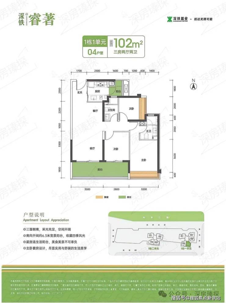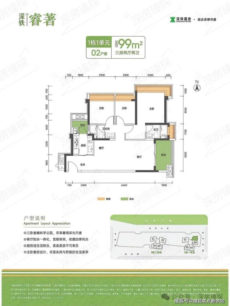 99㎡的3房2厅2卫,1栋1单元02户型,设计的是竖厅格局,客厅3.5米开间,LDKB一体化设计,进深11.7米,动静分区,三卧室朝东北向看科学公园,分别做到了主卧18.06㎡/次卧9.57㎡/次卧7.59㎡(包含飘窗),二字型厨房还带1个生活阳台,公卫三段式分离,得房率约:79.4%(不含赠送),阳台6.55㎡东南朝向。套内面积78.23㎡+赠送面积12.58㎡=实用面积90.81㎡,加上赠送后得房率约92.21%。