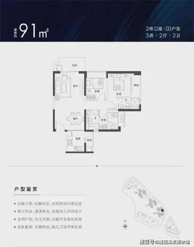 91㎡的3房2厅2卫,设计的经典竖厅格局,客厅主卧双阳台设计,厨房也带小阳台,三开间朝南,客厅朝西南向,有1个2栋D座03户型非常类似,客厅朝东北向。