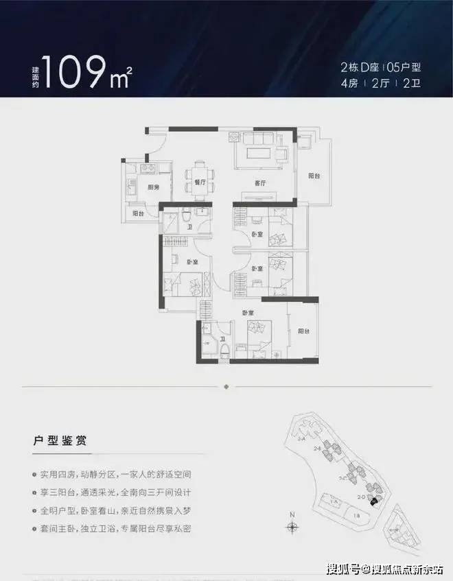 109㎡的4房2厅2卫,设计的竖厅格局,客厅主卧双阳台设计,厨房也带小阳台,四开间朝南,客厅朝东南向。