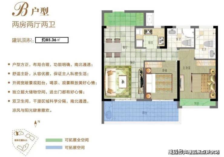 B户型:85.36㎡两房两厅两卫