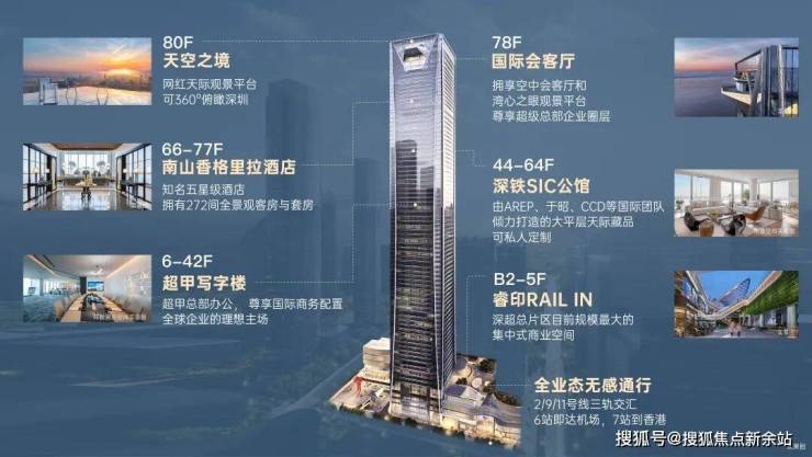 🔘全维商务配套城央都会主场◎约358米总部旗舰,总建筑面积约63万㎡,集建筑面积约10万㎡睿印RAIL IN、南山香格里拉酒店、深铁SIC公馆、超甲级办公、国际会客厅、天空之境等垂直功能于一体,集合全维旗舰配套,满足全时段商务需求。