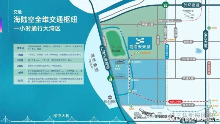 区位介绍卓越前海未来城周边交通便利,拥有地铁12号线和20号线会展北站,且距离宝安国际机场仅3站地铁车程。同时,紧邻核心主干道凤塘大道,自驾出行也非常方便。教育方面,项目周边规划了3所学校,包括2所九年一贯制学校,以及深圳第七高级中学、沙井中学、荣根学校等,教育资源丰富,适合家庭购房。