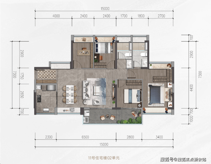 约15米南向采光面,约4.5米横厅+约6.5米全景阳台,星级主卧+灵动次卧,全生命周期适配。