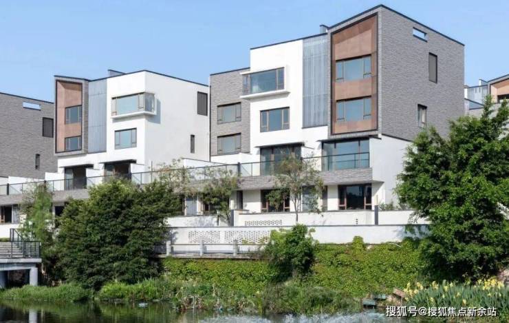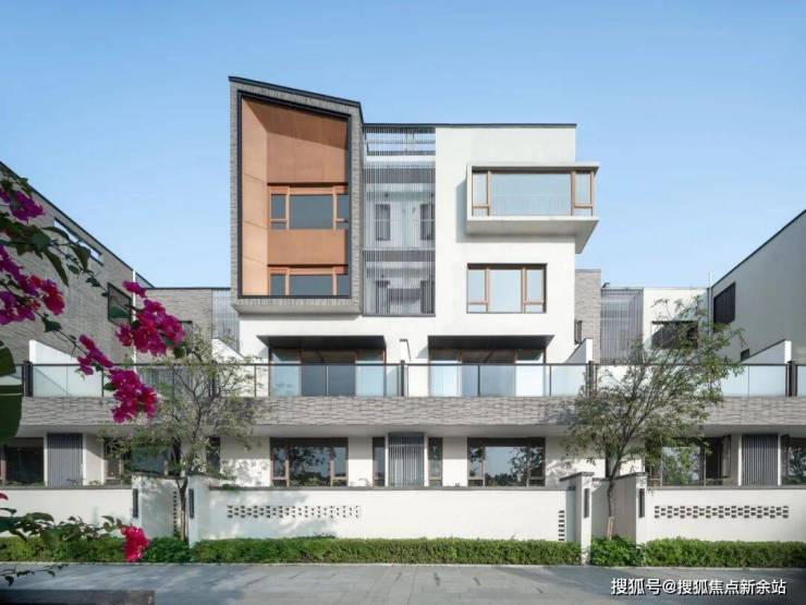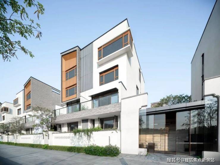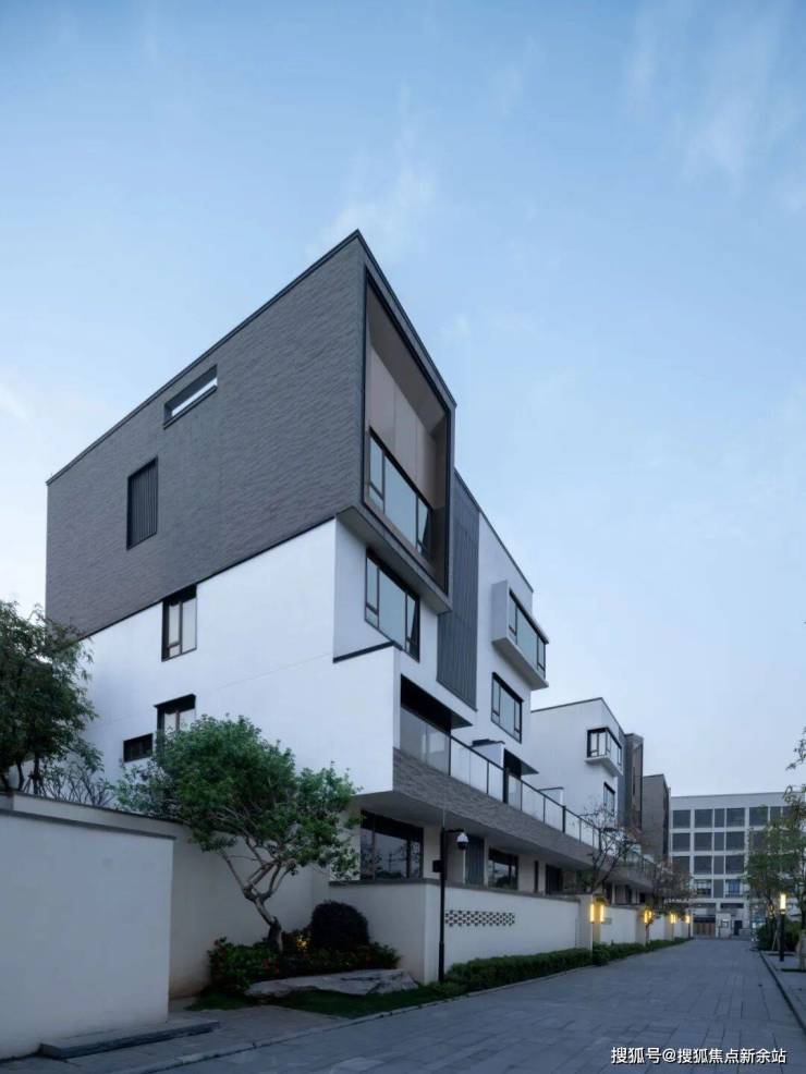 建筑外立面设计融汇古典与现代风格,采用现代构成手法,局部融入穿斗墙、斜屋顶、满洲窗等元素进行点缀,暖灰色外墙砖与米白色的质感涂料搭配,利用铝合金线条勾勒建筑的天际线,富有滴水功能的金属窗套,注重比例与细节,使得建筑的层次感与品质感得到更进一步呈现。