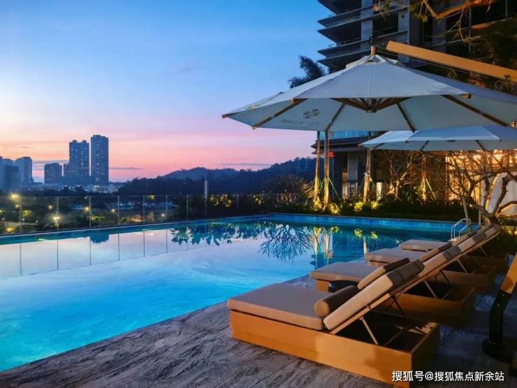 约5000㎡浮岛花园由新加坡顶奢酒店景观团队设计,四季种植紫花风铃木、古桩鸡蛋花等名贵树种,搭配露天恒温无边际泳池(底部镶嵌梵高《星空》马赛克),营造度假式居住体验。