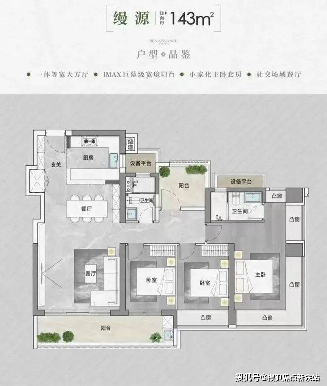 143㎡的4房2厅2卫,设计的是竖厅竖厅格局,进门入户玄关,超大宽面客厅,LDKB一体化,S墙设计预留冰箱卡槽位,四开间朝南,客厅连接次卧出巨幕大阳台,U型厨房,卫生间干湿分离,还带2个设备平台,得房率约96.14%(包含赠送),东南朝向。