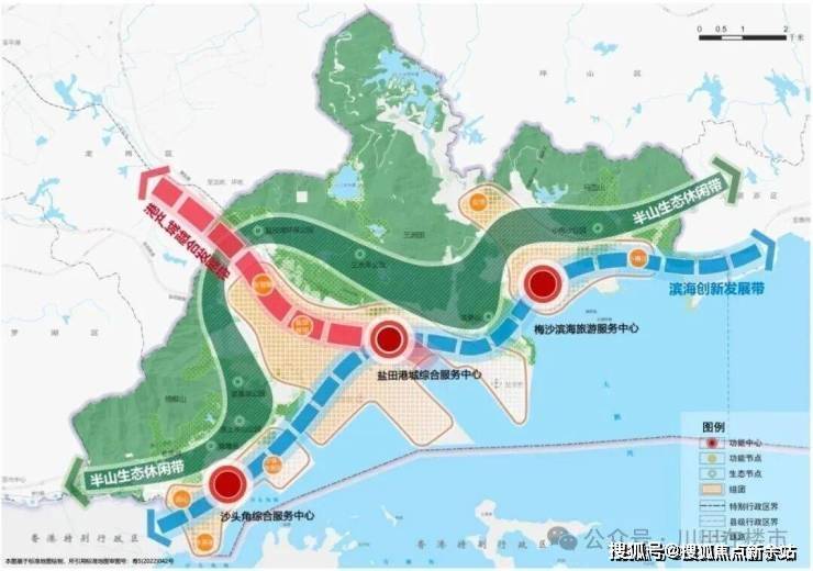 进一步提升为“梅沙黄金海岸旅游区”。盐田结合"七分山、三分城、一面海”地理特征,规划“三带、三心、三组团”,定位为深港国际消费合作区、世界级滨海旅游目的地、国际航运枢纽和离岸贸易中心、现代海洋城市示范区、东部滨海区域的综合性服务中心。