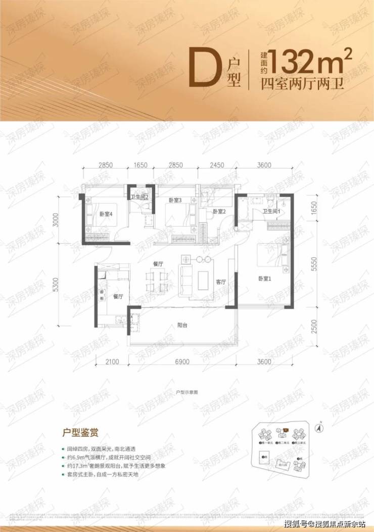132㎡的4房2厅2卫,设计的是横厅南北通透格局,客餐厅6.9米开间,LDKB一体化设计,四开间朝南,4个卧室分别做到了主卧19.98㎡/次卧10.26㎡/次卧10.26㎡/次卧8.82㎡(包含墙体飘窗),U型厨房,公卫三段式分离,得房率约90.2%(包含赠送),阳台主朝正南向。