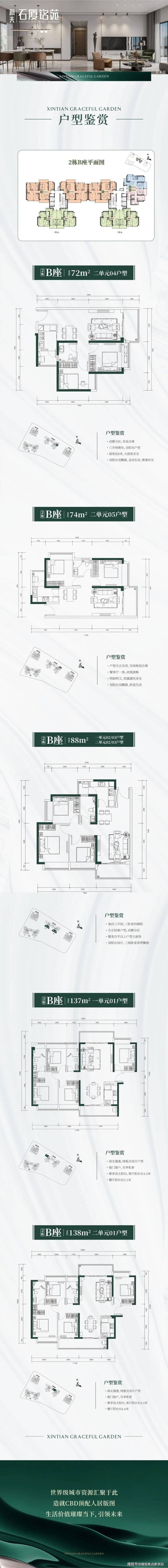 二单元2梯5户:01户型138㎡(4房);02户型88㎡(3房);03户型88㎡(3房);04户型72㎡(2房);05户型74㎡(2房)