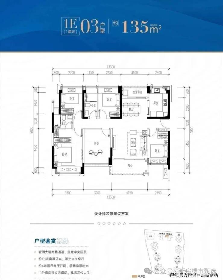 项目首推1栋B/G/H/E座,共333套,户型建面为81㎡3房2卫、89-109㎡4房2卫和135m²5房2卫。