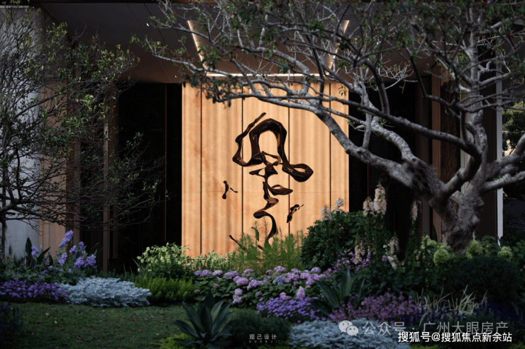 5栋的「云栖·西派艺术馆」 雕塑长廊与立体庭院串联,巧妙地陈设“风”字的金属雕塑、形似层峰叠峦的艺术壁画、融入白云山沉淀的绿宝石。