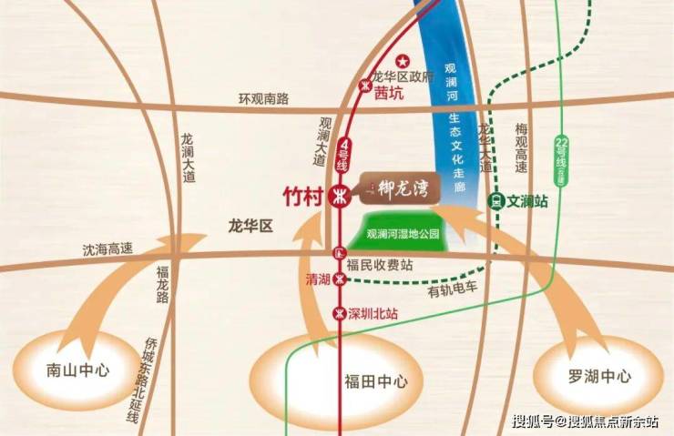 御龙湾西园紧邻地铁4号线竹村站,是观澜方向进入龙华区的首站,可便捷连接福田口岸、深圳北站等核心区域。