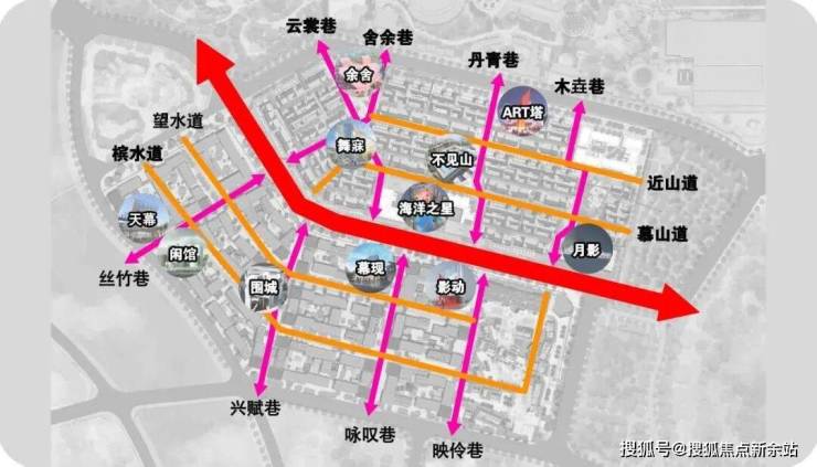它们与横向四条街道:近山道、慕山道、望水道、槟水道,共同构成了小镇的血管脉络,并联通了小镇的点睛之笔——八大艺术酒店。