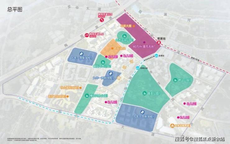 鸿荣源观城总占地面积约68万㎡,其中有40万㎡属于鸿荣源,包含住宅、商业、产业,还有约28万㎡由鸿荣源代建移交政府的公共配套,包含绿化、水系、公园、学校、医院、养老院、文体设施等。