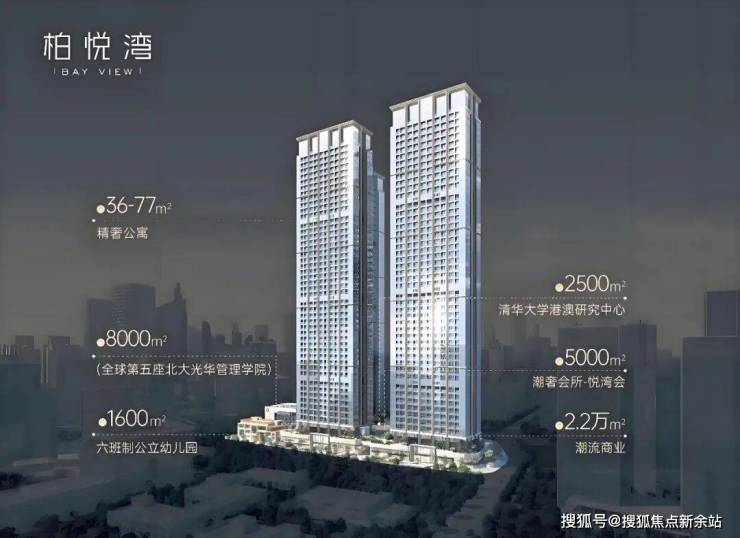 恒裕柏悦湾由2栋47层高公寓与2栋42层商办组成项目自带·约2.2万㎡潮流商业·约5000㎡精英会所·约8000㎡北大光华管理学院(北大光华瑞思楼)·约2500㎡清华大学港澳研究中心·约1600㎡六班制公立幼儿园共同组成约37万㎡垂直综合体——200米深湾超级地标